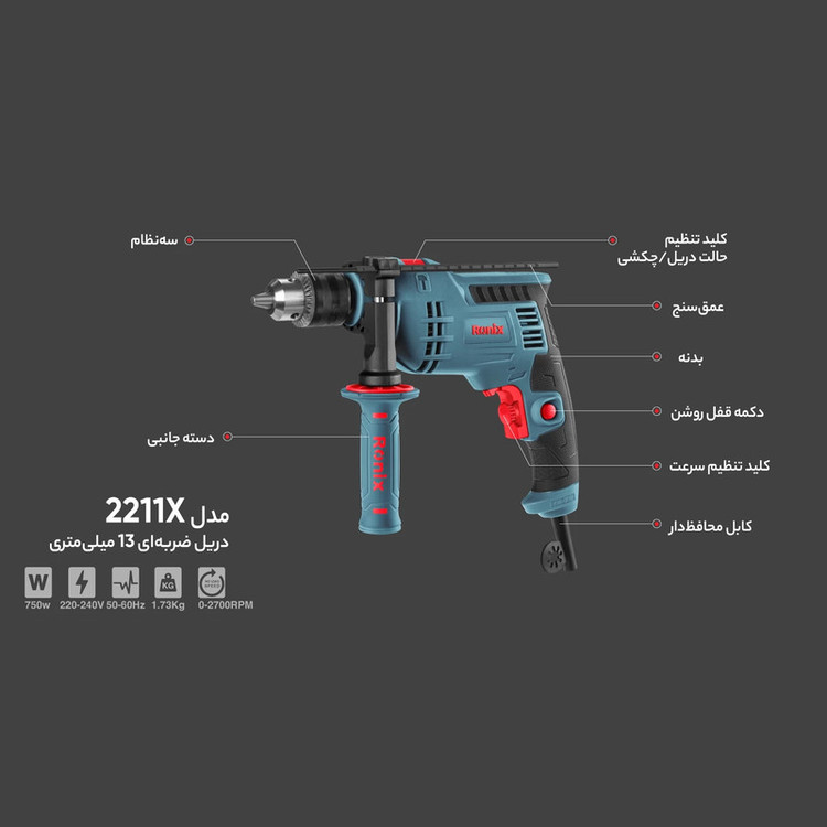 دریل چکشی 2211X رونیکس دارای یک موتور قدرتمند 750 واتی است که میتواند سرعتی بالغبر 2700 دور در دقیقه را ایجاد کند. این سرعت توسط کلید دیمردار کنترل سرعتی که در این ابزار تعبیه شده، قابل تنظیم است. همچنین با قابلیت چکشی در 2211X رونیکس، هیچ نگرانی در زمان سوراخکاری انواع مصالح نخواهید داشت. دامنه کاربری آن را بیشتر میکند. سهنظام 13 میلیمتری این دریل، تمامفلزی، مقاوم و از نوع آچاری است. طراحی ارگونومیک، کوچک، کمحجم و 1.73 کیلوگرمی (1.93 کیلوگرم با دسته )به منظور استفاده از ابزار در زمانی طولانیتر؛ ساختهشده از فیبر شیشهای تقویتشده (PA6+GF30)؛ خوشدست و قابل حمل؛ قابل استفاده در مکانهای مختلف؛ مجهز به دسته جانبی ارگونومیک با هدف کنترل بهتر دستگاه؛ دارای میله تنظیم عمق برای قابلیت سوراخکاری دقیقتر با عمق معین؛ دارای کابل 2 متری است.