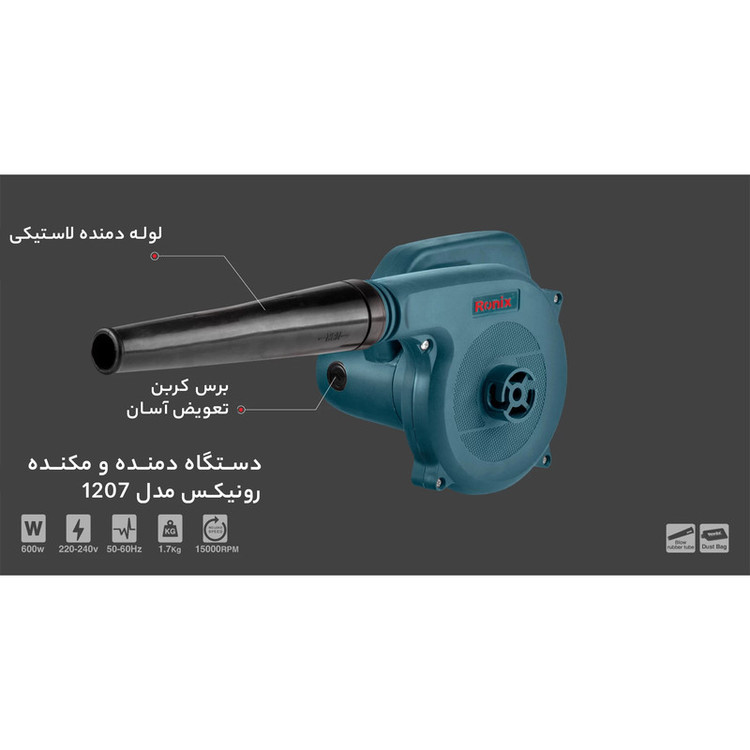 بلوور برقی مدل 1207 دارای موتور پرقدرت 600 وات است که مجهز به فن پرقدرت و توربو می باشد. این محصول دارای قابلیت دمنده و مکنده به صورت همزمان می باشد. این دستگاه دارای کلید تغییر سرعت روی بدنه جهت تنظیم سرعت حین کارکرد با دستگاه است و دارای لوله دمنده و مکنده لاستیکی می باشد.لید این دستگاه مجهز به شصتی قفل کن است که موجب سهولت در در انجام کار مداوم همچنین دارای دیمر می باشد تا سرعت پرتاب باد را کم یا زیاد نماید. دماغه بلند و کیسه جمع کننده گرد و خاک از مشخصه های این دستگاه است. طراحی پایه برای ابزار باعث تعادل دستگاه حین کار شده و طراحی آرگونومیک دسته باعث جلوگیری از تعریق می شود